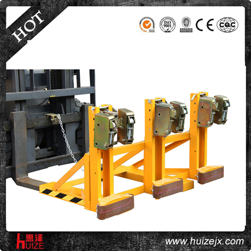 重型三油桶夾具單鷹嘴純機(jī)械機(jī)構(gòu)設(shè)計(jì)可與叉車(chē)方便地配合,僅依靠叉車(chē)的動(dòng)作,不需要其它的動(dòng)力,可自動(dòng)一次搬運(yùn)3個(gè)塑料油桶, 配置可拆換式柔性耐磨保護(hù)墊,有效保護(hù)油桶并緩沖叉車(chē)行駛過(guò)程中的震動(dòng), 能在集裝箱等這樣狹小的環(huán)境內(nèi)裝卸桶裝物質(zhì),可極大地提高空間利用率, 與貨叉連接配有自鎖裝置確保油桶夾在坡度上和顛簸路面使用時(shí)不會(huì)滑落.